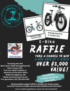GPIA is holding a raffle for a PAIR of e-bikes valued at over $3,000. The drawing will be at Stone Crab Music Festival on November 9. Tickets are available for a donation of $5 each or 5 for $20. You can get your tickets at the GPIA office located at 10484 Stringfellow Rd., Suite 2, Saint James City. See flyer for more details.